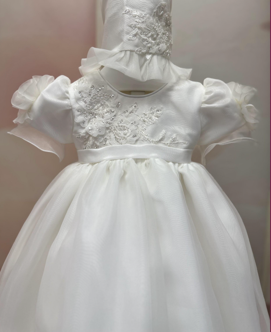 This elegant ivory gown features a delicate organza overlay that adds a graceful dimension to its silhouette. The puff cap sleeves offer a refined, timeless charm, while intricate appliqué detailing enhances its sophisticated appeal, making it an exquisite choice for formal occasions.