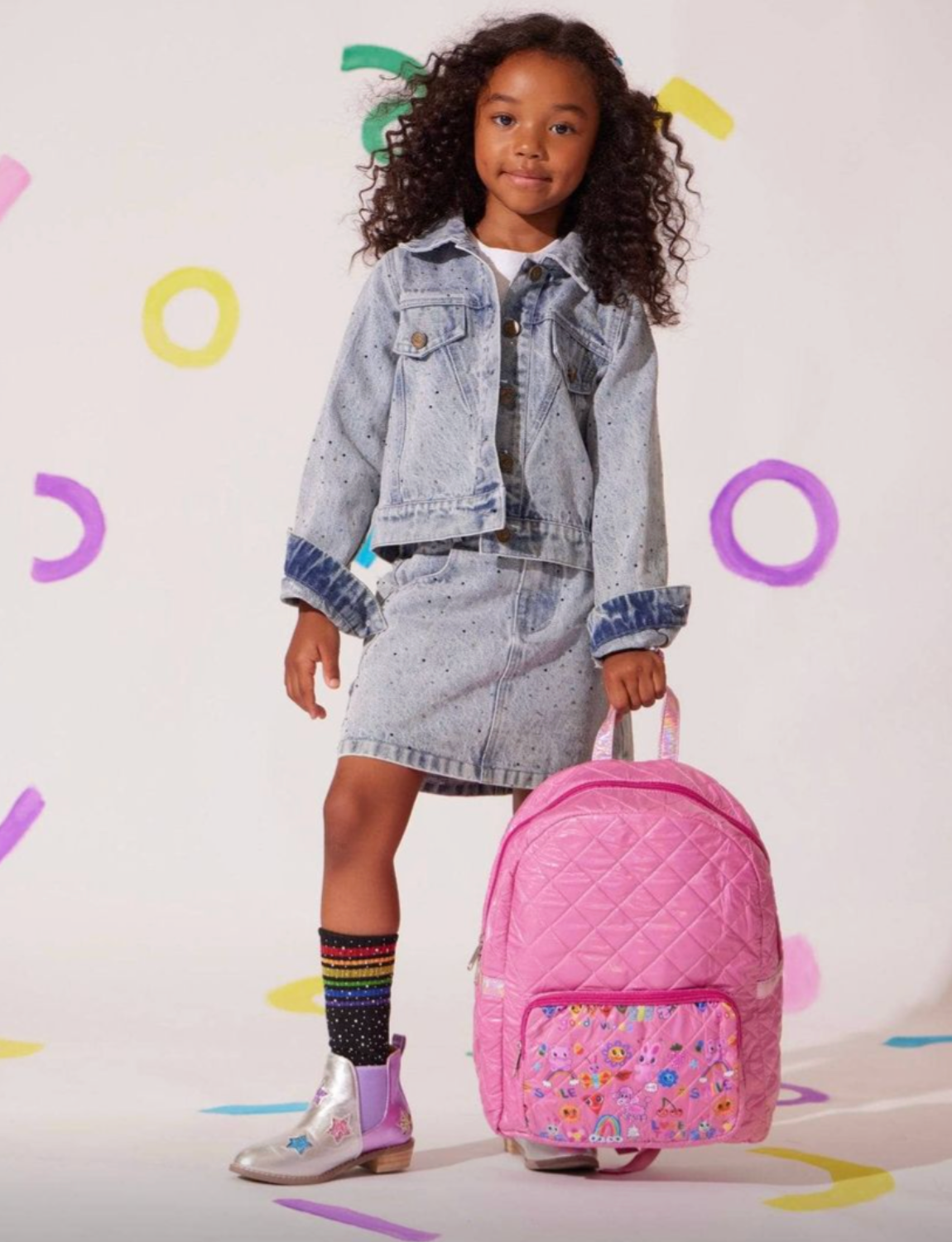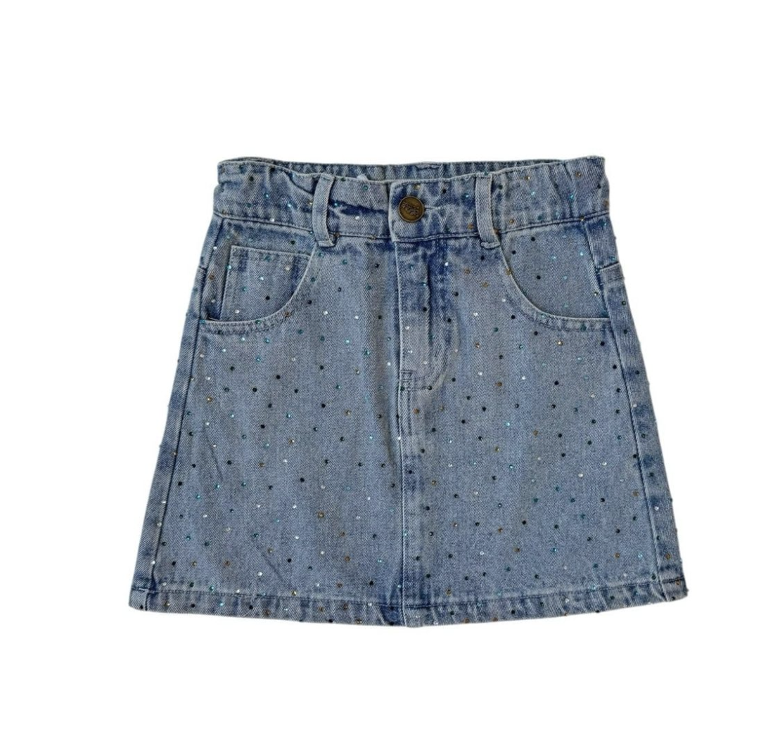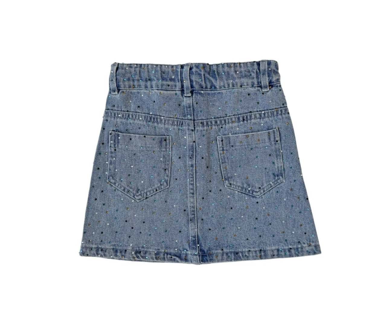 Elevate your everyday style with this trendy denim skirt featuring a subtle sparkle finish that catches the light beautifully. The timeless A-line silhouette is enhanced with button details and functional front pockets, making it both fashionable and practical. Layer it with your favorite graphic tee, cozy sweater, or denim jacket for an effortlessly cool look that works from day to night.