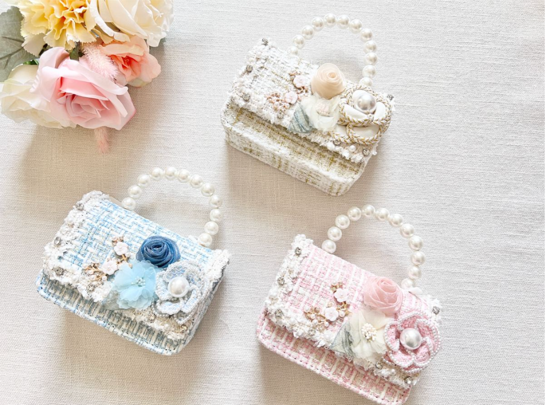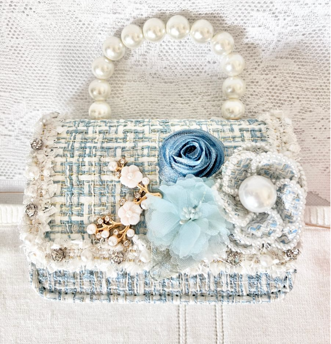 Go for a retro-chic style with our Blue Tweed Bag! Made with blue tweed and a pearl handle, this girls...