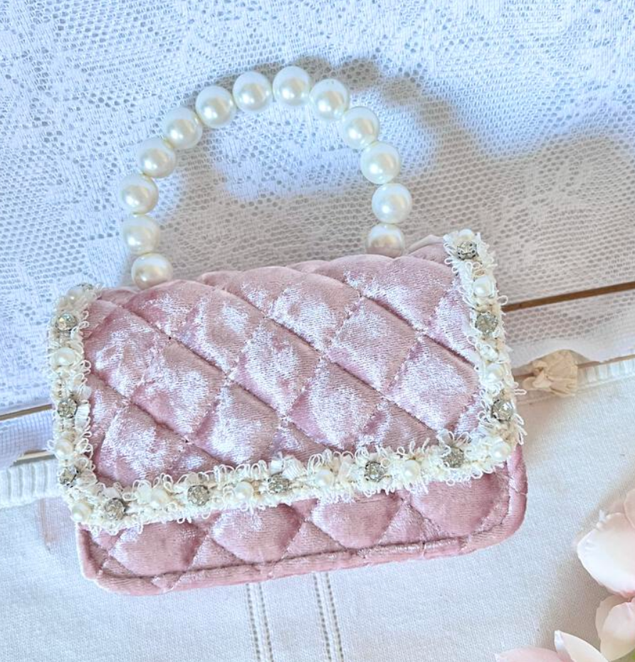 This velvet purse with a pearl handle and optional chain is perfect for our little girls this holiday season. Carry all your essentials in style with this vintage-inspired bag. Perfect for adding a touch of chic to any outfit.