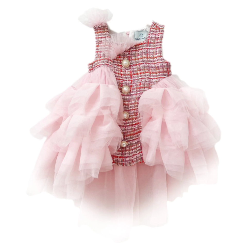 Tweed romper with pink tulle ruffle skirt attached. The tweed fabric has beautiful tones of pink, red, lavender, and gold...
