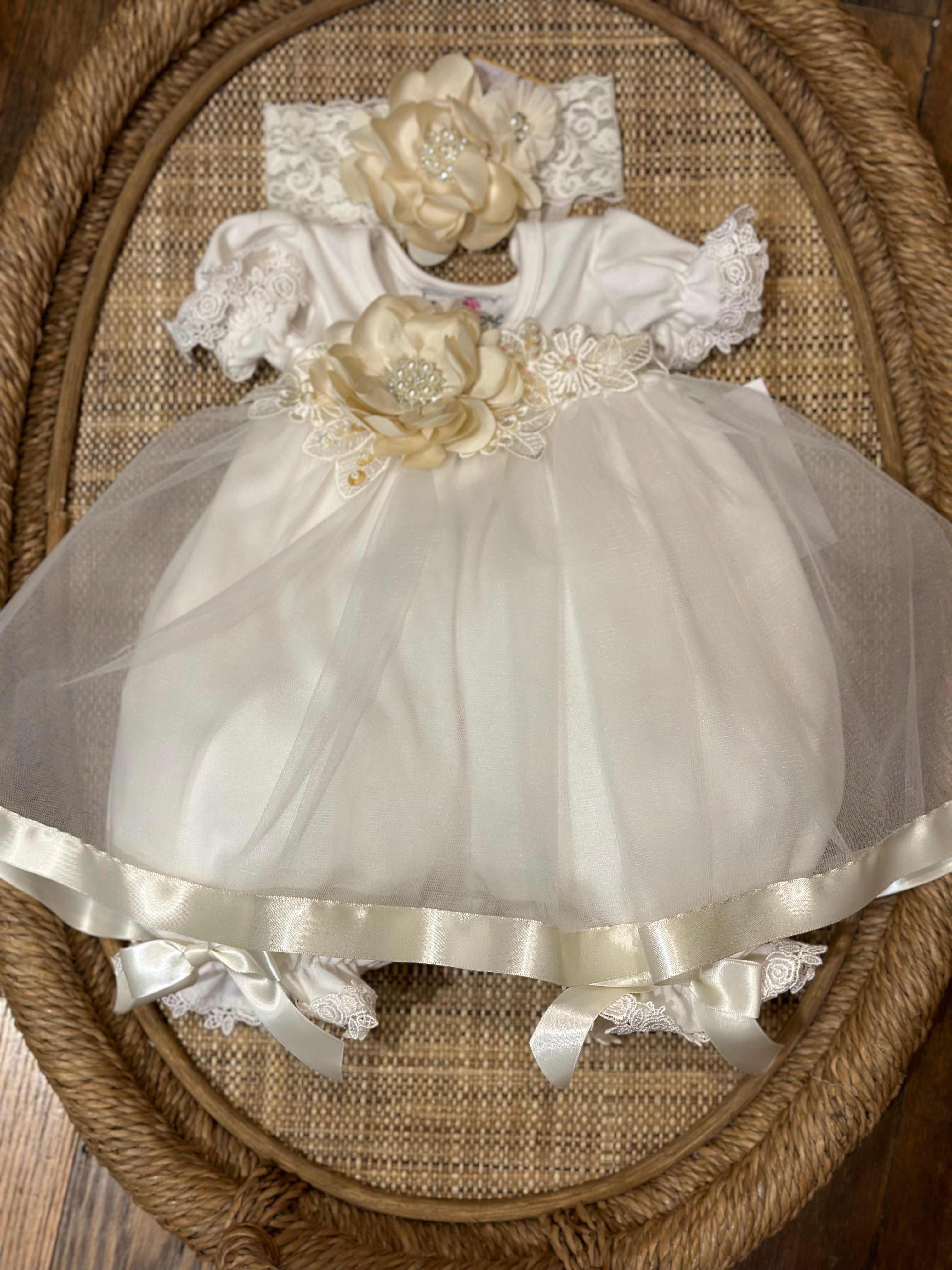 Indulge in luxury with the Infant Amara Bloomer Dress. The champagne and ivory tones evoke sophistication, while the satin-trimmed tulle...