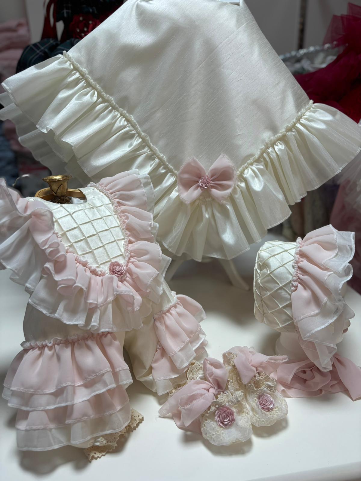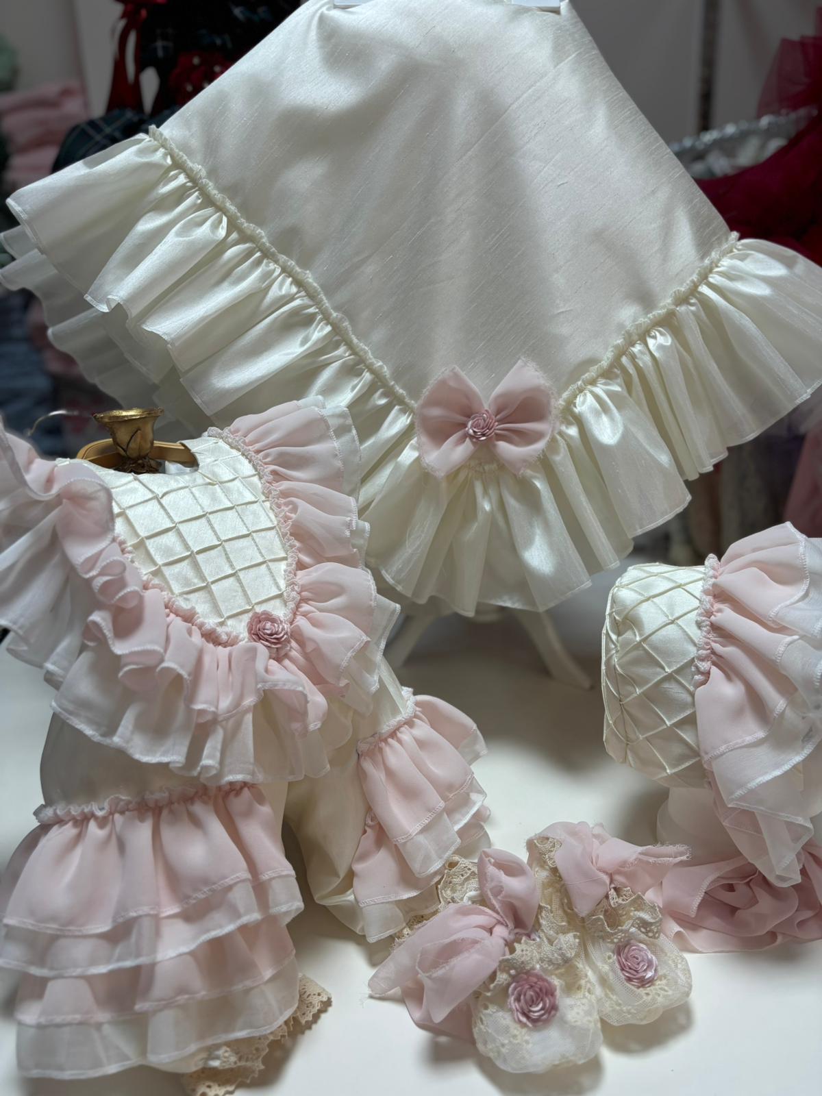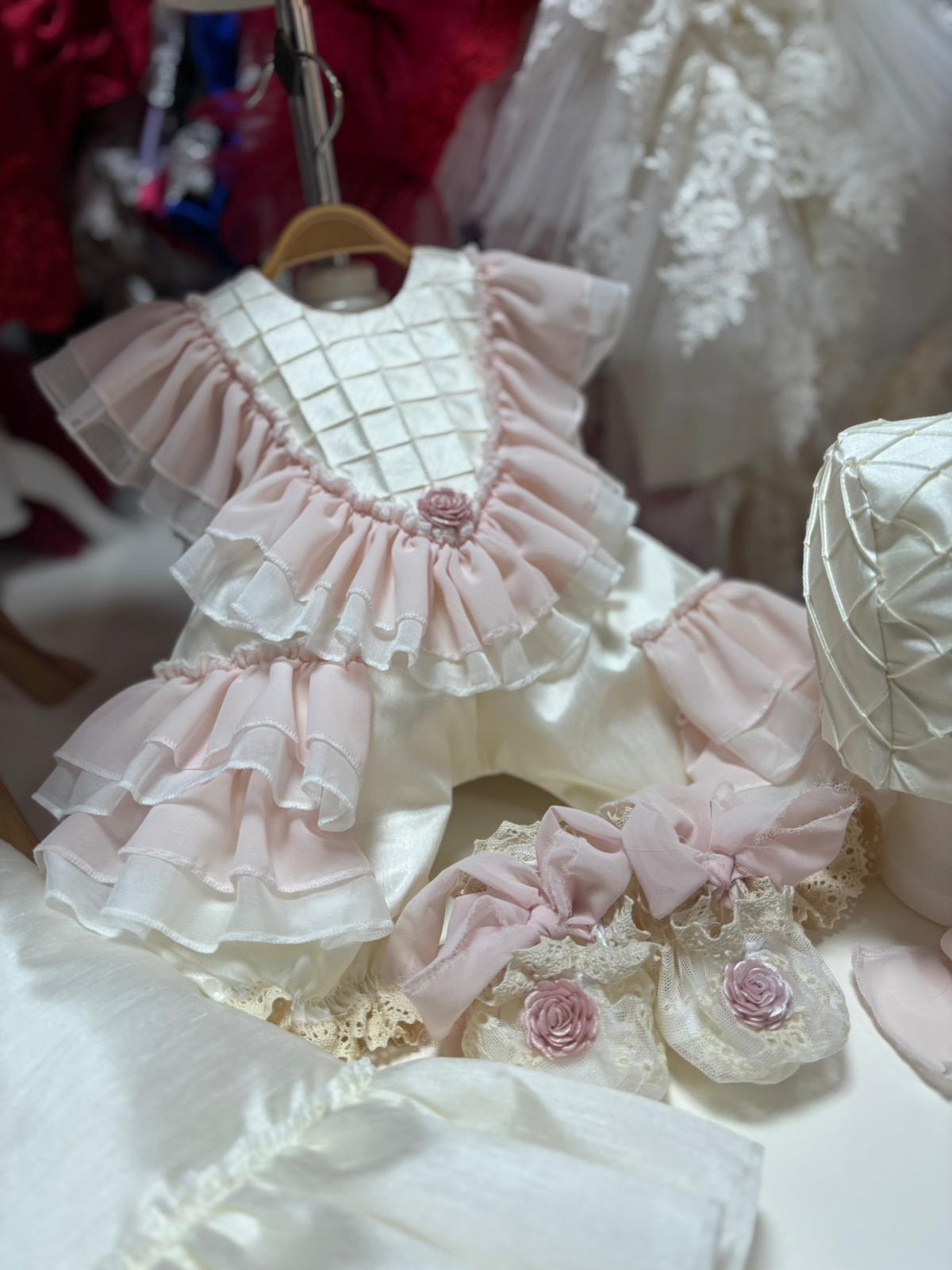 This pure silk bubble romper features delicate ruffles for a timeless, elegant look. Designed with comfort in mind, it comes complete with a matching bonnet and booties, making it a perfect ensemble for your little one’s special occasions. Available soon in our collection. Blanket available, sold separately