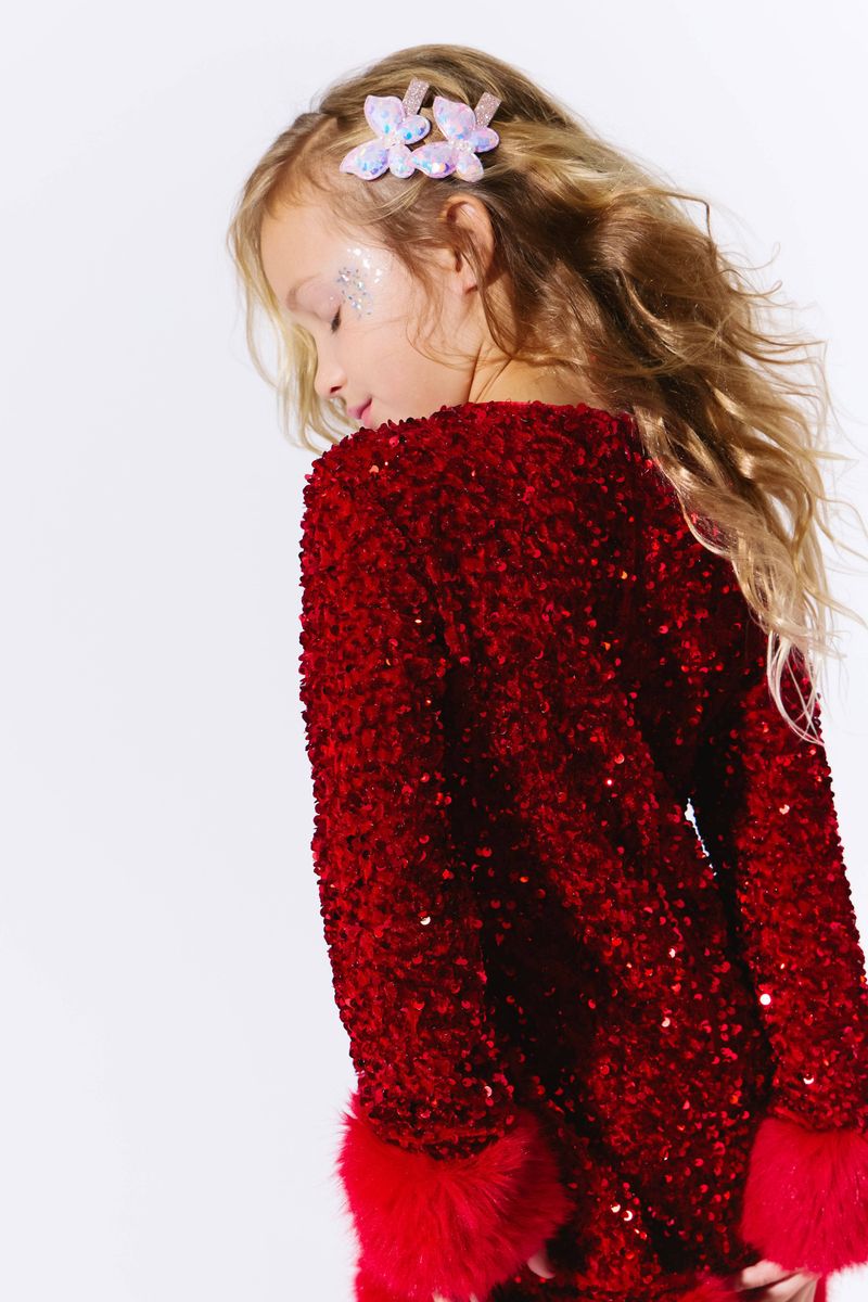 Elevate your holiday look with the Ruby Shimmer Dress, featuring vibrant red sequins that catch the light beautifully. The elegant faux fur trim at the hem and cuffs adds a festive touch, while the comfortable fit allows for effortless movement and celebration. Made from premium sequin fabric complemented by soft faux fur, this dress combines style and comfort perfectly. Easy care instructions ensure it stays radiant season after season.