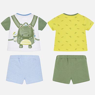 Four piece set for newborn baby boy composed of two combinable sets. Both sets include a short sleeved t-shirt and a pair of shorts. Made from soft elasticated cotton fabric.
