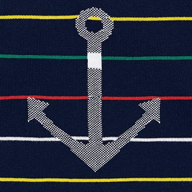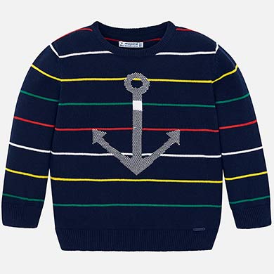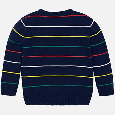 Long sleeved sweater with elasticated cuffs for boy. Round neckline. Made from 100% cotton fabric. Decorative elements: design on the front. Striped pattern.
