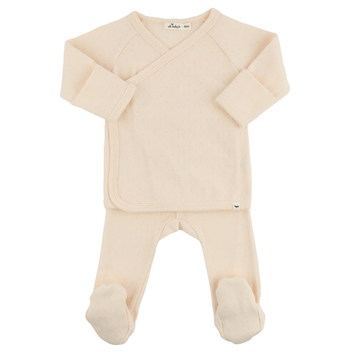 The oh baby! Pointelle Kimono Set offers easy skin-to-skin contact with its side tie kimono top. Made from 100% soft cotton, it's gentle on baby's delicate skin. Includes cozy footie pants. Available in infant sizes.