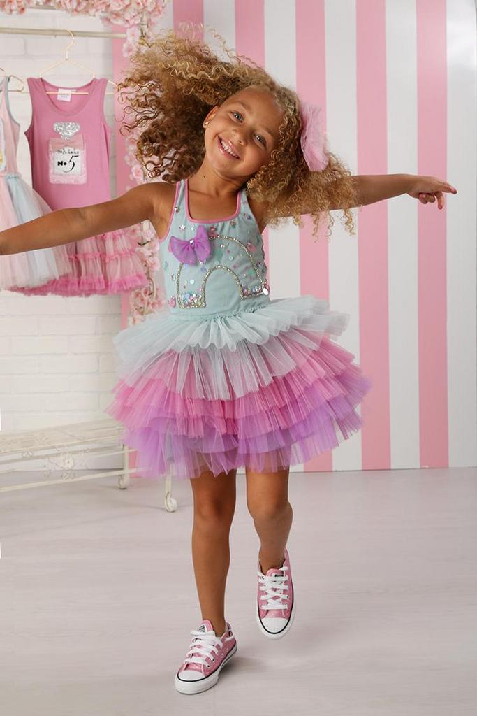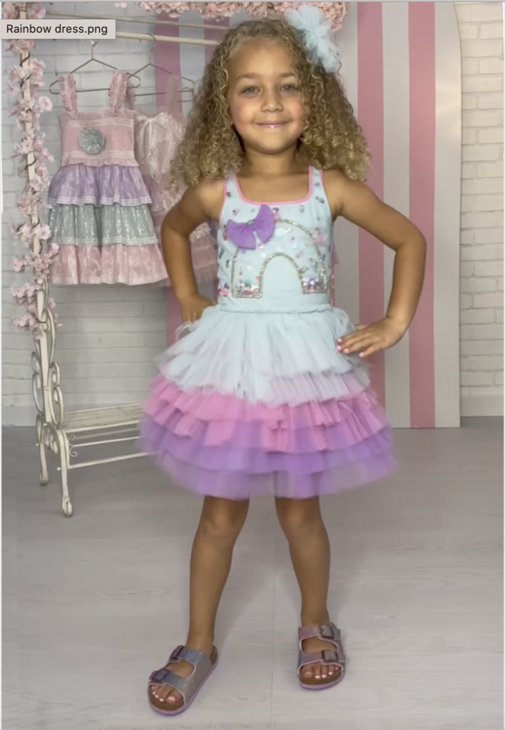 "Get ready to brighten up your wardrobe with our Rainbow Dress! With its playful tulle skirt layered in a vibrant sky, candy pink, and violet, you'll feel like you're floating on a colorful cloud. And don't forget the rainbow bodice with a charming violet bow, adding a touch of fun to your style! (Warning: may cause rainbow envy!) "