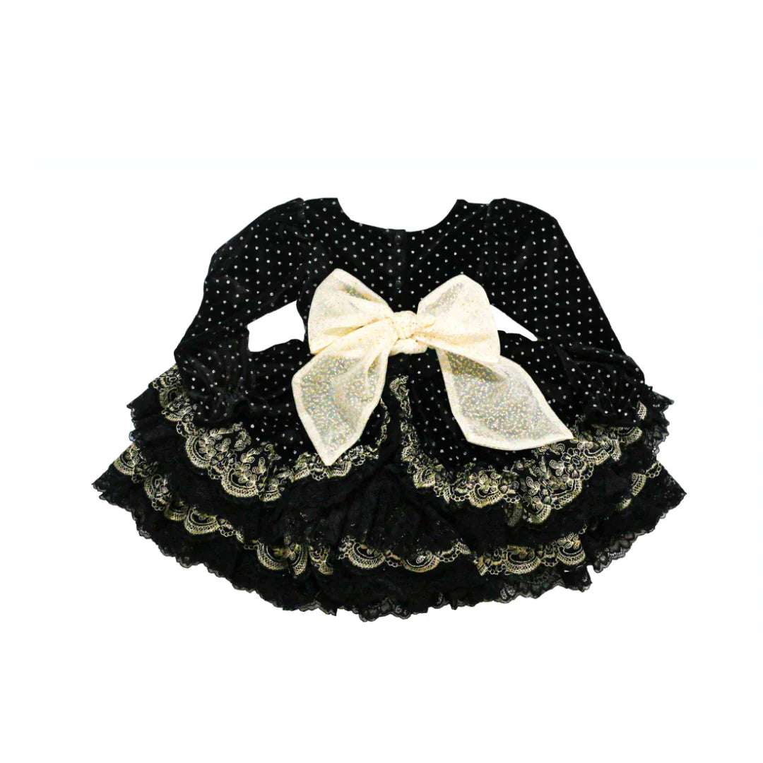 This black dotted dress features a full skirt with delicate trim, elegant long sleeves, and a stunning bow detail at...