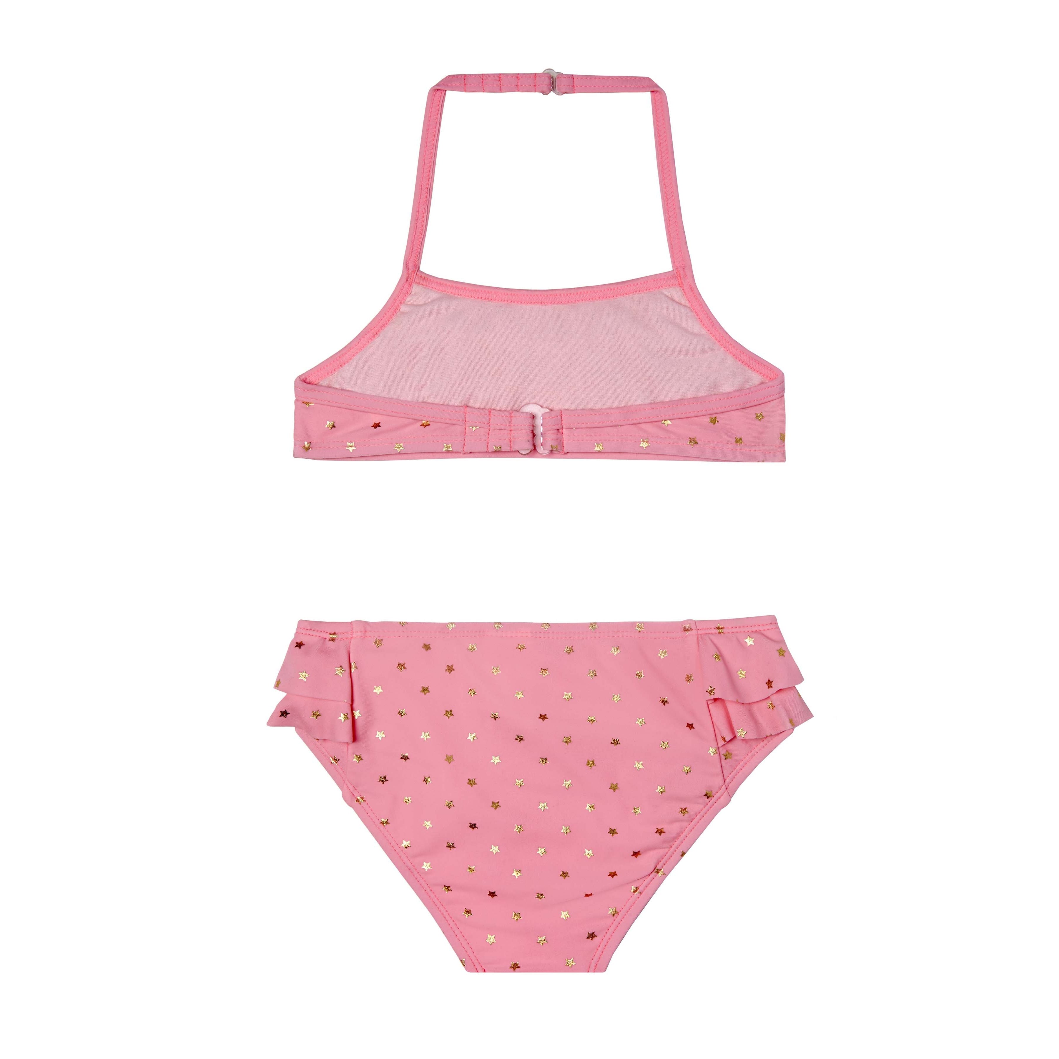 This adorable two piece bikini has sparkles all over the top and bottom. Love the ruffle top and full coverage bottom.