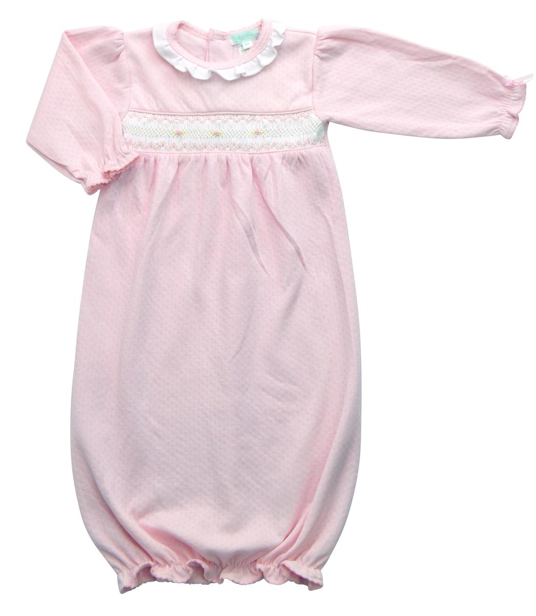 "ive your little one the sweetest dreams in our Sweet Pink Gown. This adorable infant gown features delicate embroidered roses on smocking, adding a touch of charm to bedtime. With its soft pink color, your baby will look and feel cozy all night long.