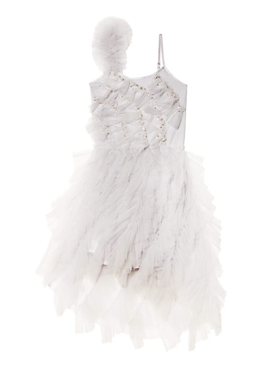 Close your eyes and dream in the Little Treasures Tutu Dress. An asymmetrical-layered and shaped tulle skirt cascades like waterfall from an embellished beaded, and tulle bodice in shimmery silver, and crisp winter white. A shoulder ruffle is stitched atop one of the adjustable straps for added elegance!